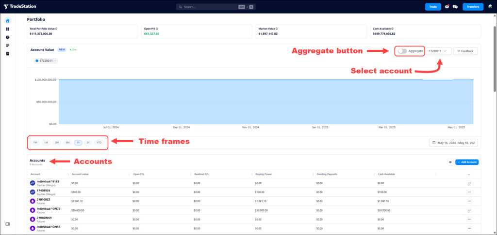 Key stats like account value, profit and loss (P/L) and available cash appear along the top. There’s also an equity curve, or chart showing historic changes in the account’s value. A drop down menu above the chart lets customers change accounts, while the Aggregate button combined values across all accounts.
