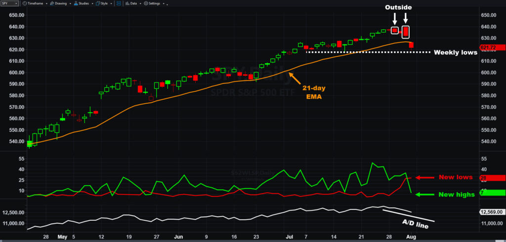 Second, the index closed below its open each day. Those solid candlesticks can indicate investors are selling into strength. A bearishad an oalso an outside candle on the weekly time frame.