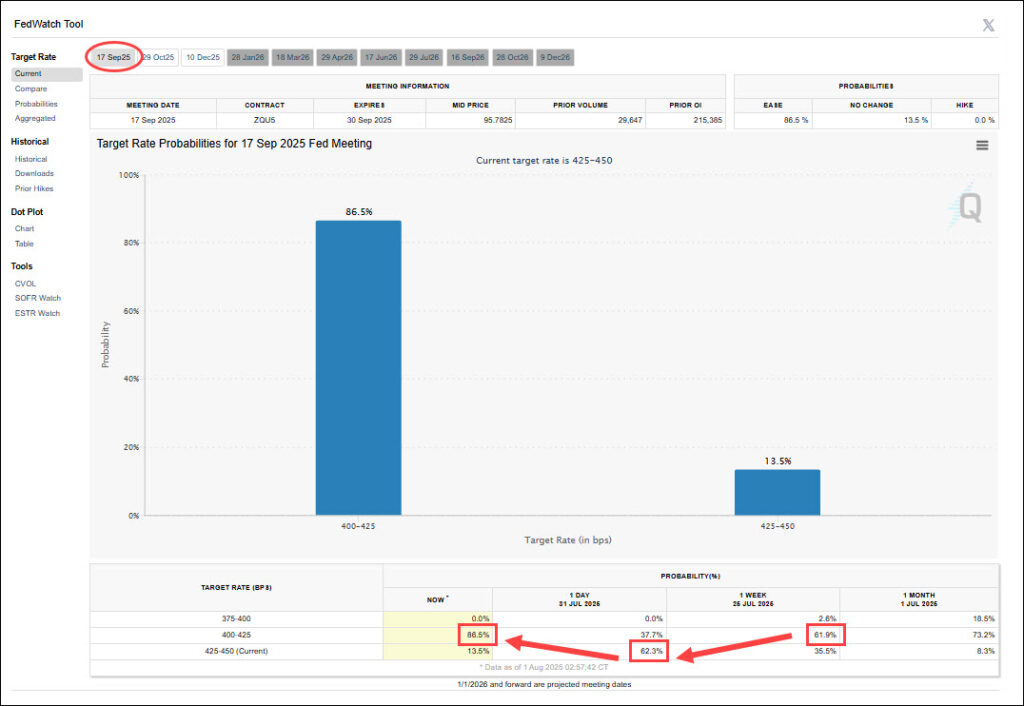 CME’s FedWatch tool showing probabilities of a September rate cut. Notice the sharp changes over the course of last week.
