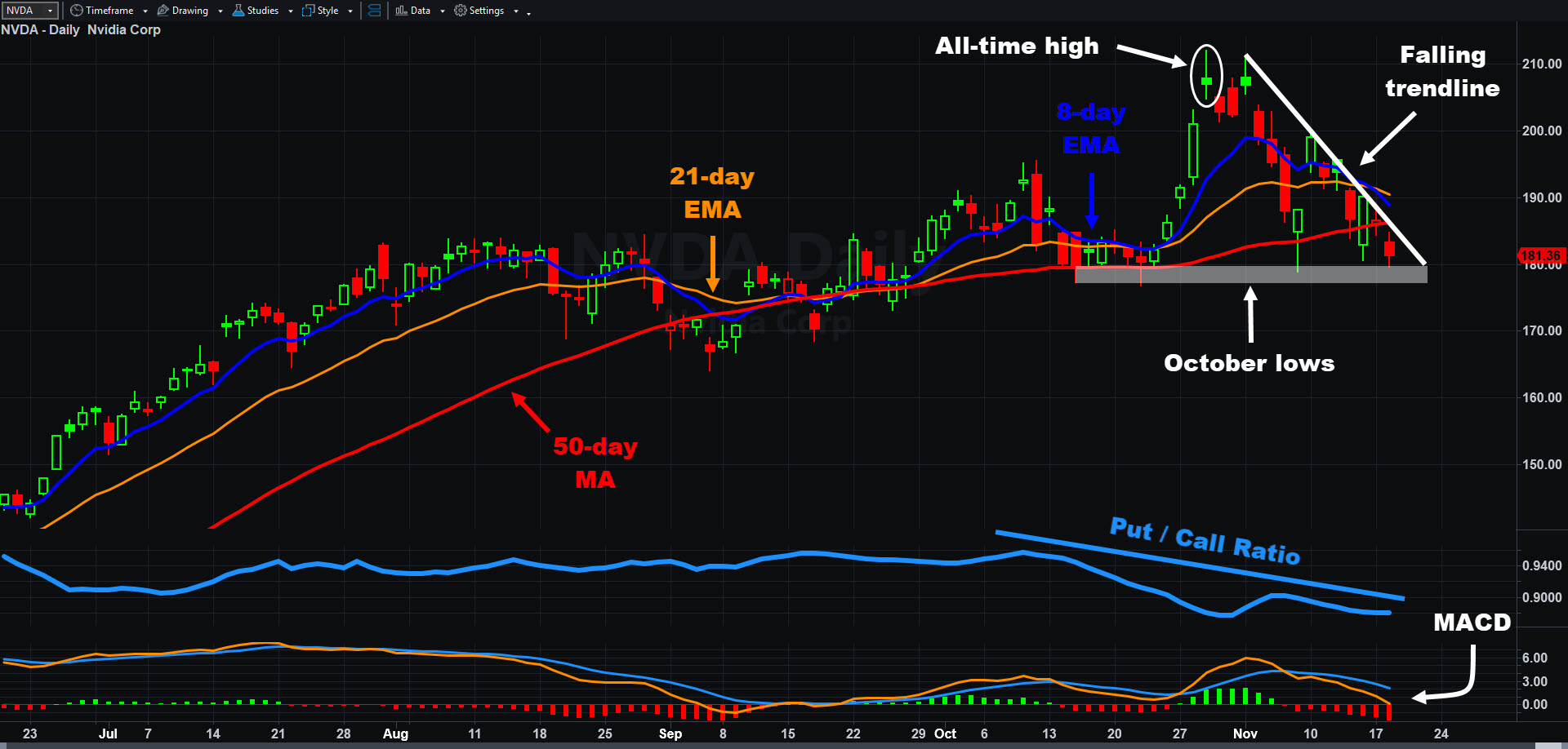 Nvidia (NVDA), daily chart, with select patterns and indicators.