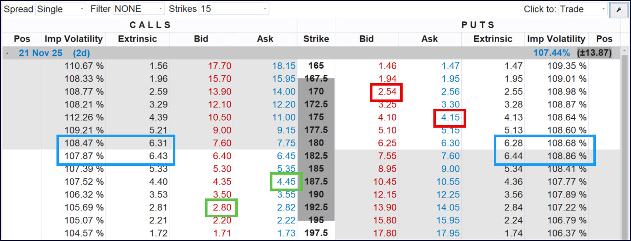 OptionStation Pro with blue boxes showing extrinsic values and implied volatility. Calls marked in green and puts marked in red.