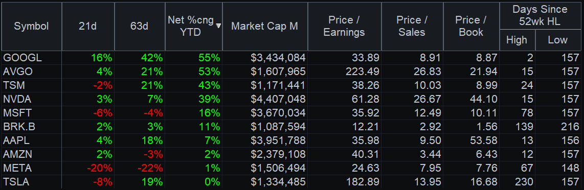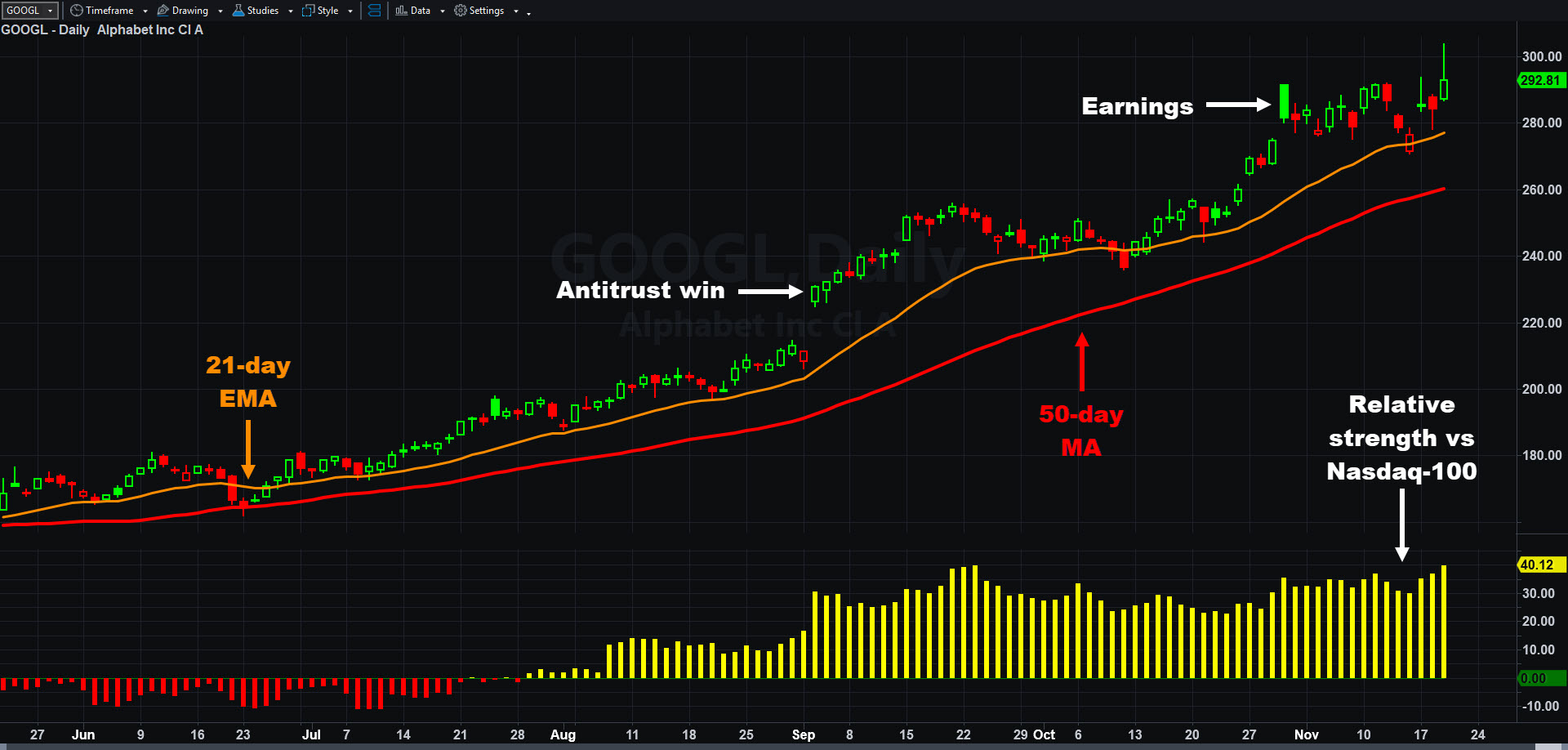 The screenshot below compares GOOGL with other companies sporting market caps of at least $1 trillion. GOOGL is the best-performing company on the list in the last month (21d), last three months (63d) and year-to-date. It’s also the only member of the group to hit a new high in the last two weeks. That highlights its relative strength as the broader Nasdaq-100 pauses.