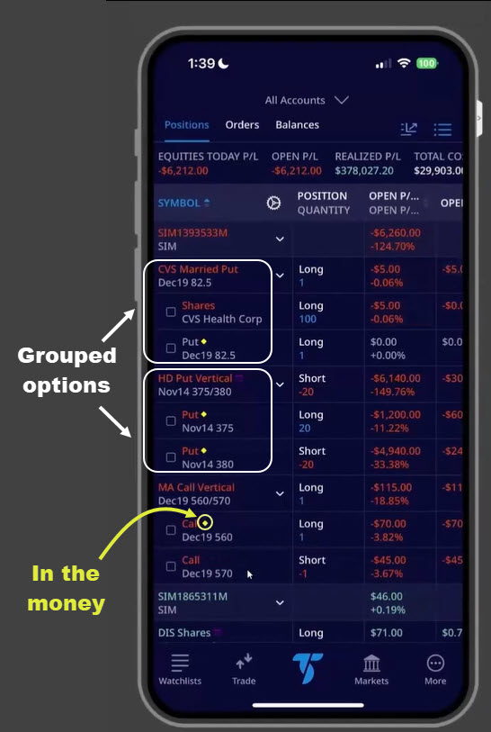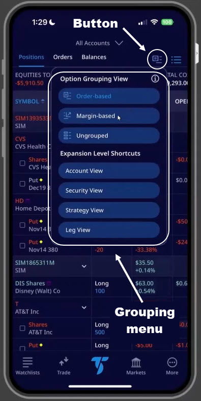 TradeStation’s mobile app, with grouping menu shown.