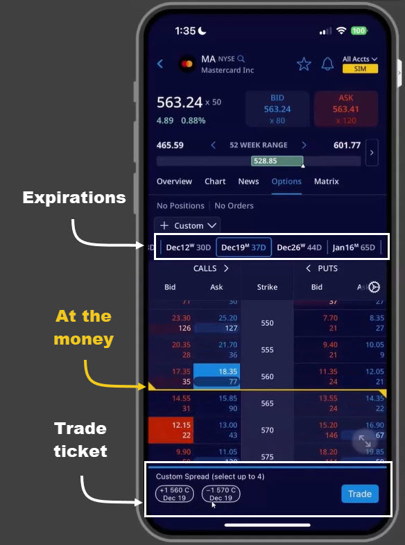 Mobile app’s options chain, with key features marked.