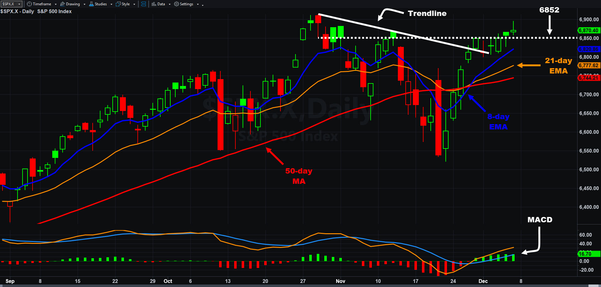 Prices had been trapped under 6,852 for more than a month. (That was the low on October 29 before November’s slide.) They were in a tight range below the resistance most of last week, but closed above it on Friday.