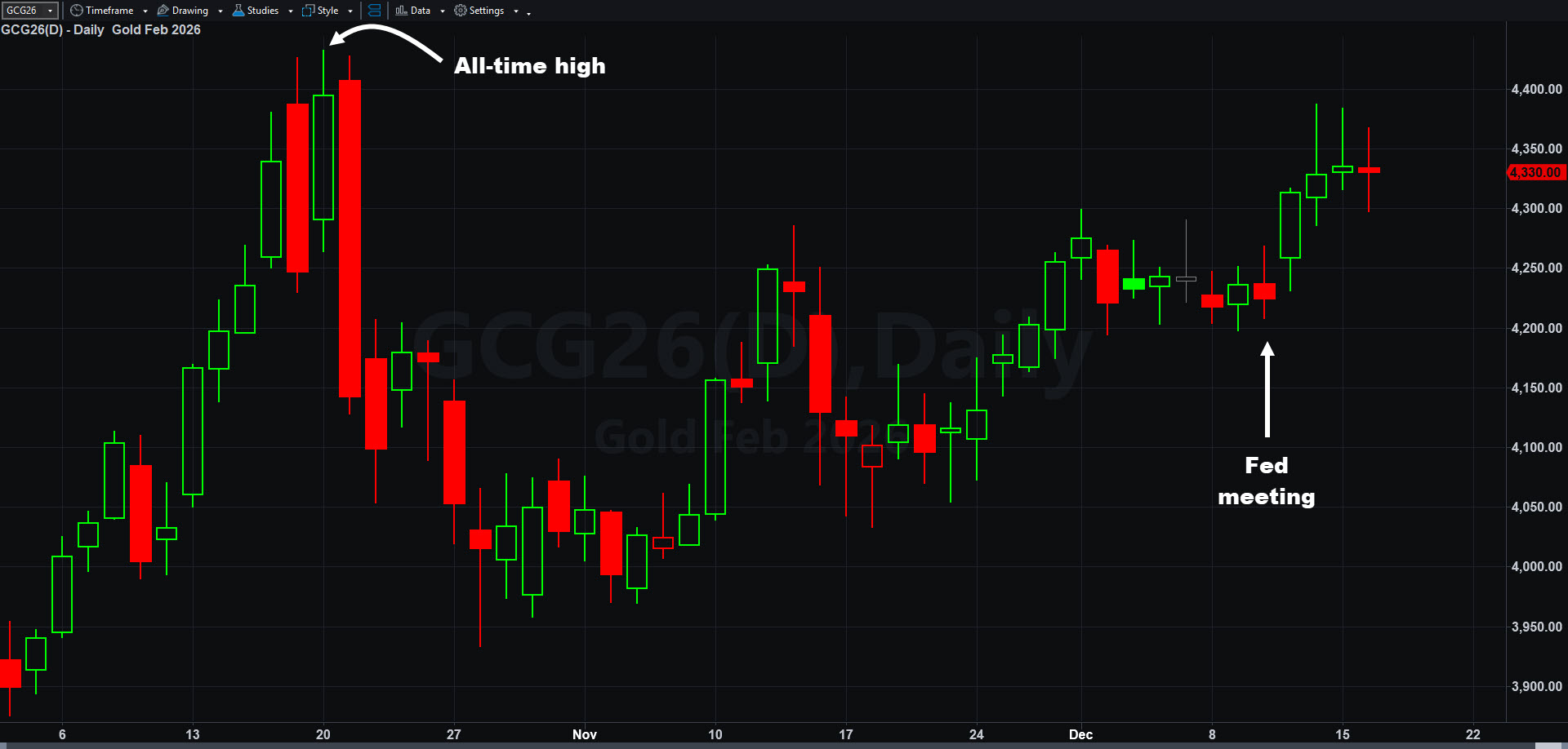 GCG26 traded for about 4,340 last Thursday after the Fed meeting. It’s rallied about 90 since, translating into an increase of approximately $9,000. (See our margin requirements page for more.)