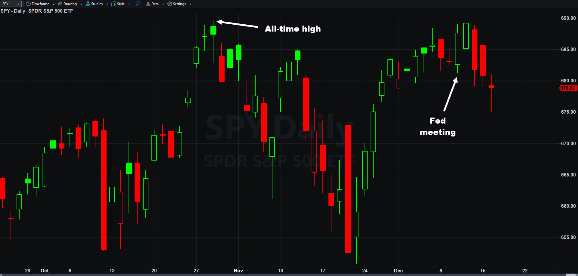 SPY traded around $683 last Thursday, following the Fed’s announcement. A trader might have targeted the December expiration, with contracts expiring this Friday, December 19.