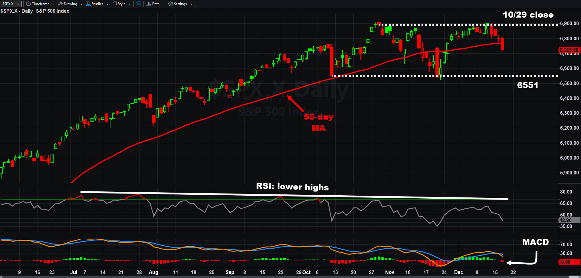 S&P 500, daily chart, with select patterns and indicators.