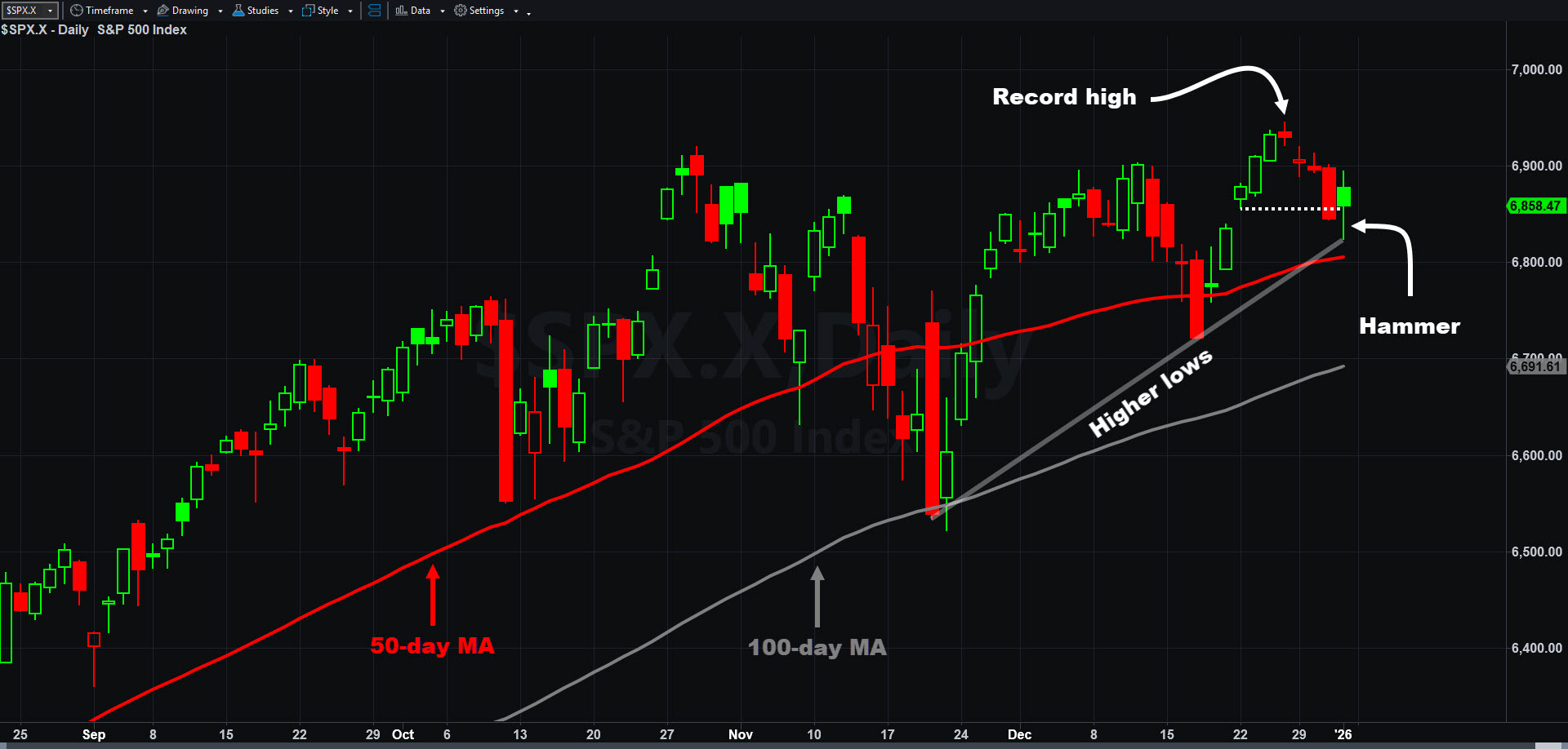 S&P 500, daily chart, with select patterns and indicators.