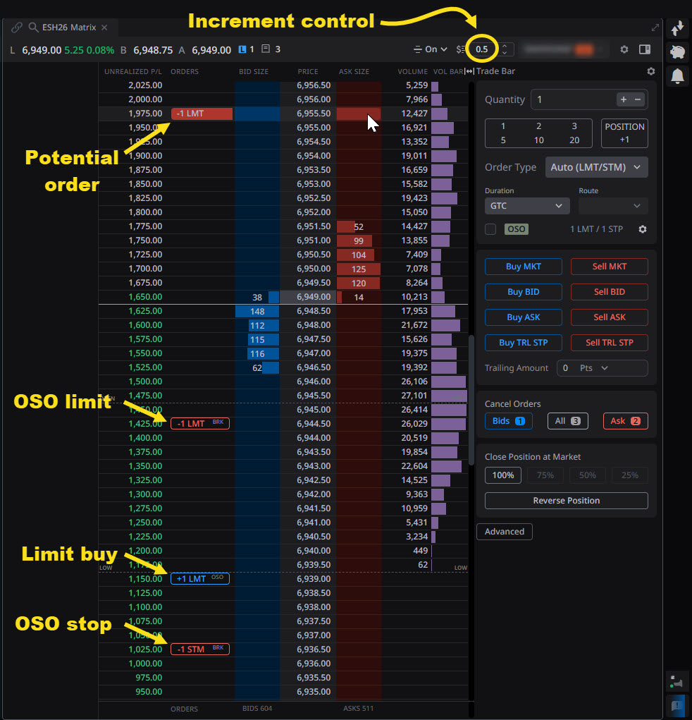 The Price Increment box is another breakthrough in the TITAN X Matrix. This control allows users to aggregate depth-of-market and volume data around bigger increments. That can be especially useful for products like E-mini S&P 500 futures, which trade in 0.25 ticks. (Increasing the increment makes more price action visible in Matrix.)