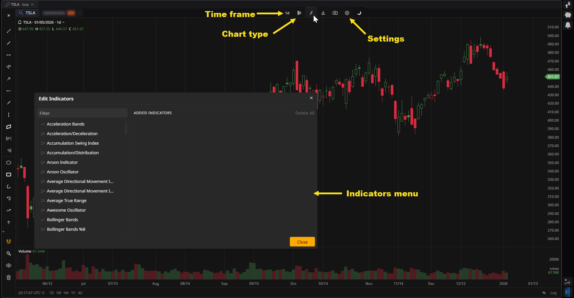 Tesla (TSLA), daily chart, on TITAN X, showing select controls and settings.