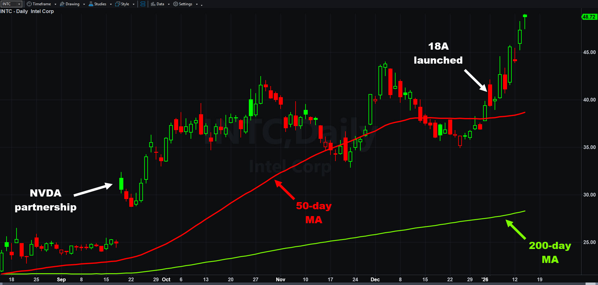 Intel (INTC), daily chart, with select patterns and indicators.