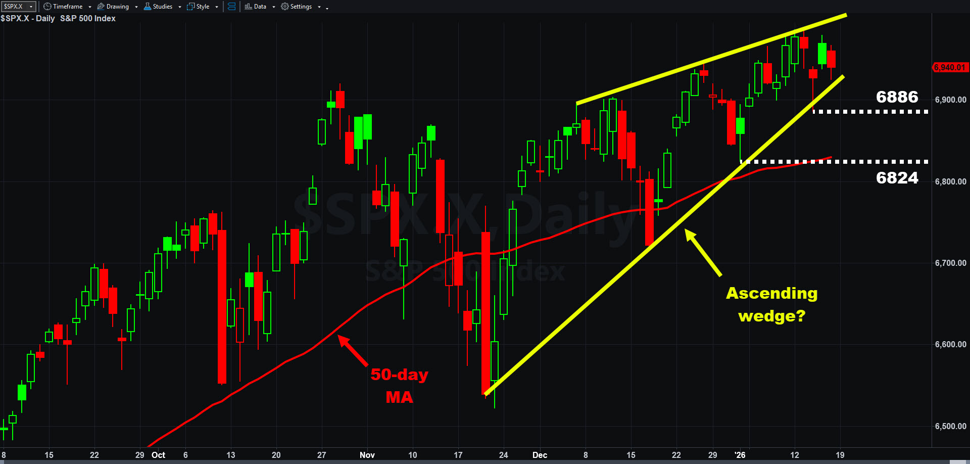 While those signals could appear negative, traders may want confirmation of a breakdown. That could prompt them to watch last week’s low of 6,886 as an important level. Below that is the January 2 low of 6,824, which is also near the 50-day moving average.