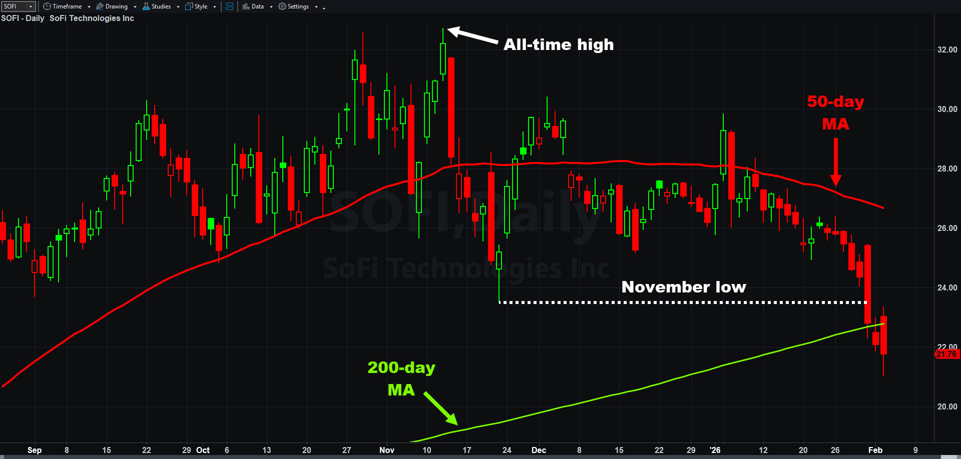 SOFI fell 1.45 percent to $21.76 yesterday and is down 17 percent so far this year. The company reported better-than-expected earnings and revenue last Friday. It attempted to rally on the news, but sellers drove it lower in the first 90 minutes of trading.