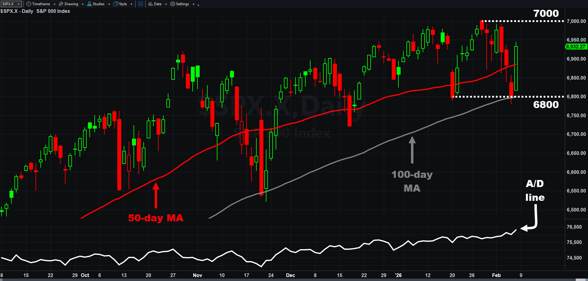 S&P 500, daily chart, with select patterns and indictors.