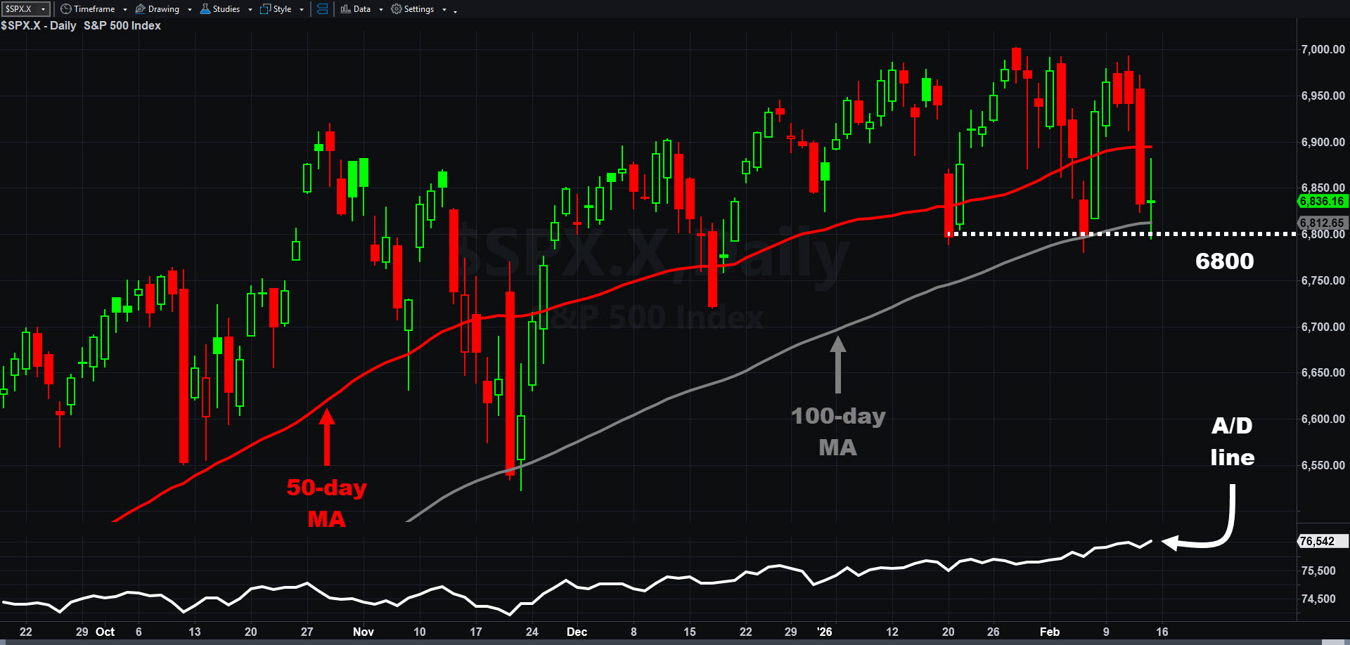 S&P 500, daily chart, with select patterns and indicators.