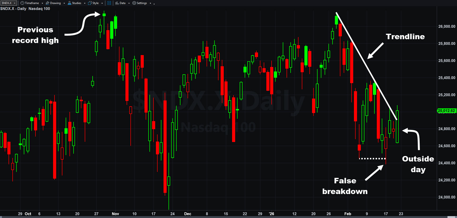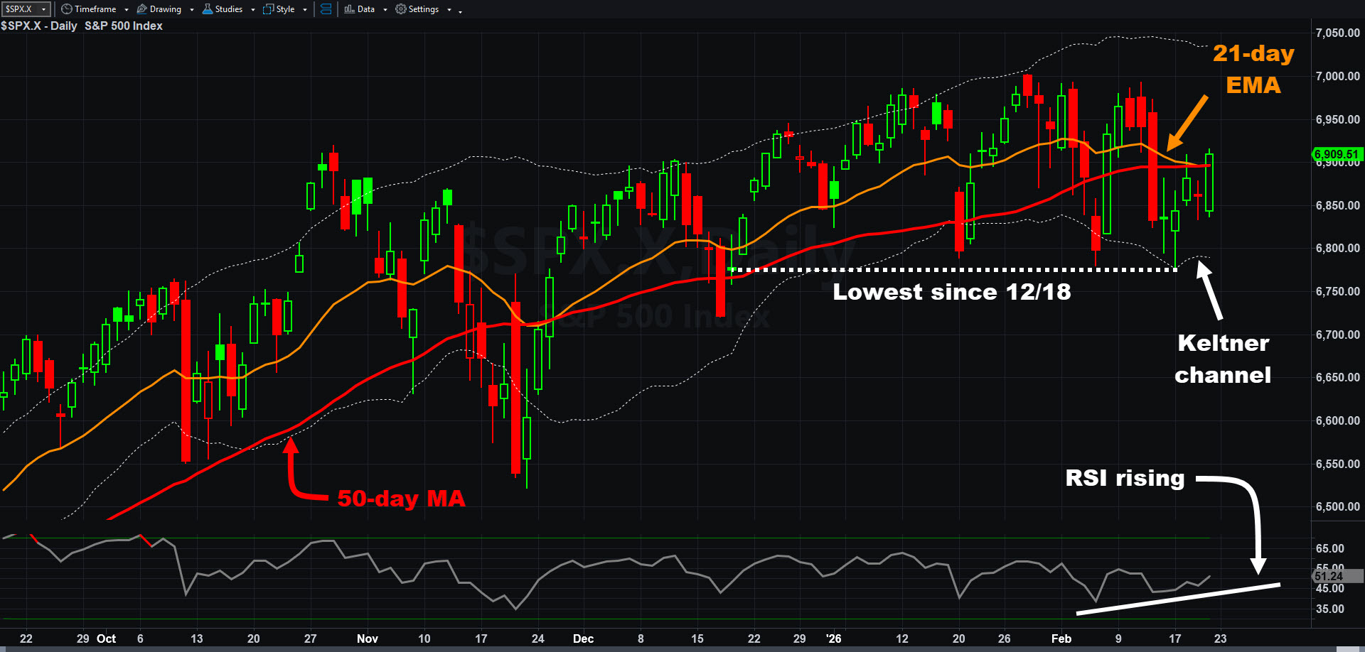 Chart watchers might have also noticed that the index had a false breakdown below its February 5 low before rebounding. It also ended last week with a bullish outside day (a lower low and higher high than the previous session). Those may be viewed as positive reversal patterns.