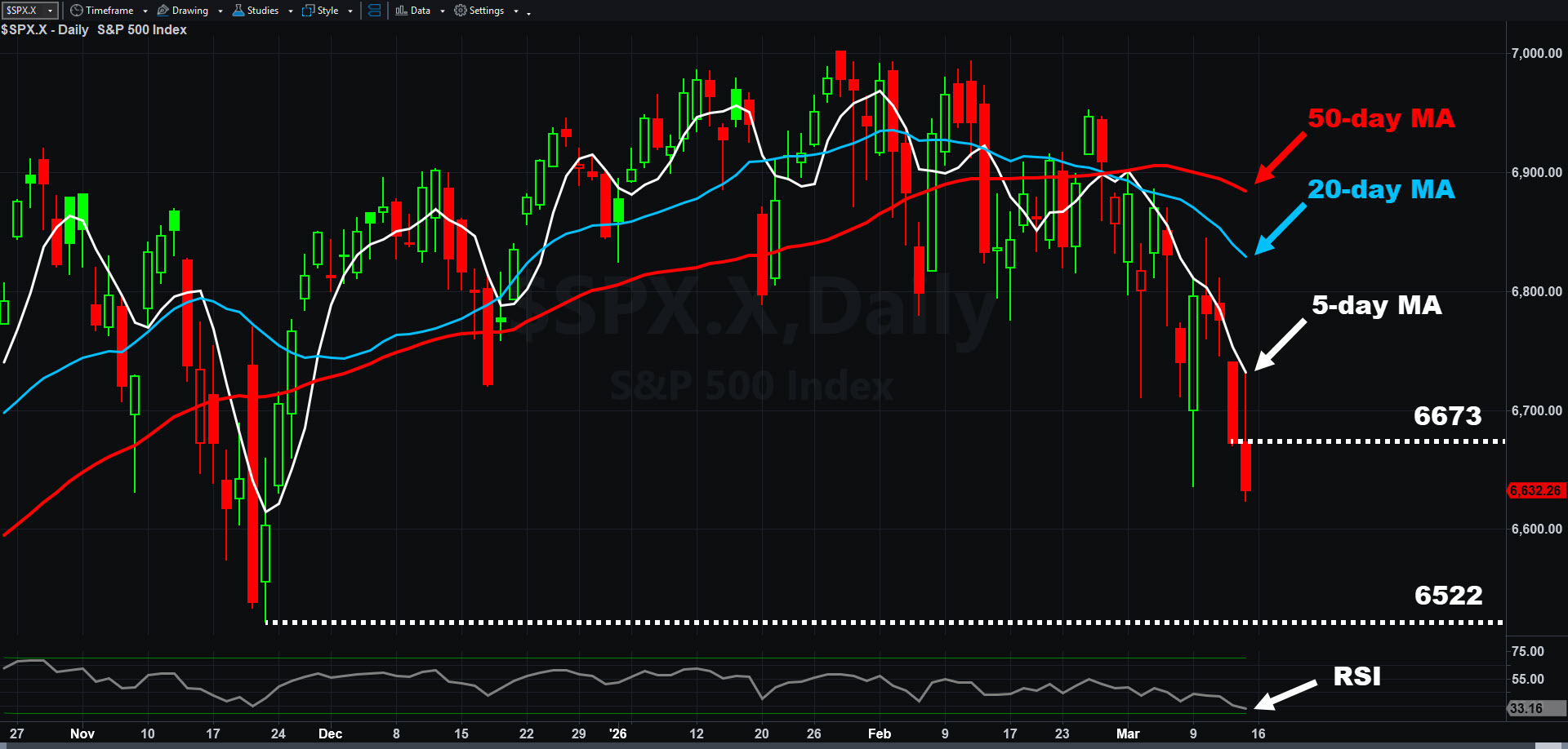 S&P 500, daily chart, with select patterns and indicators.