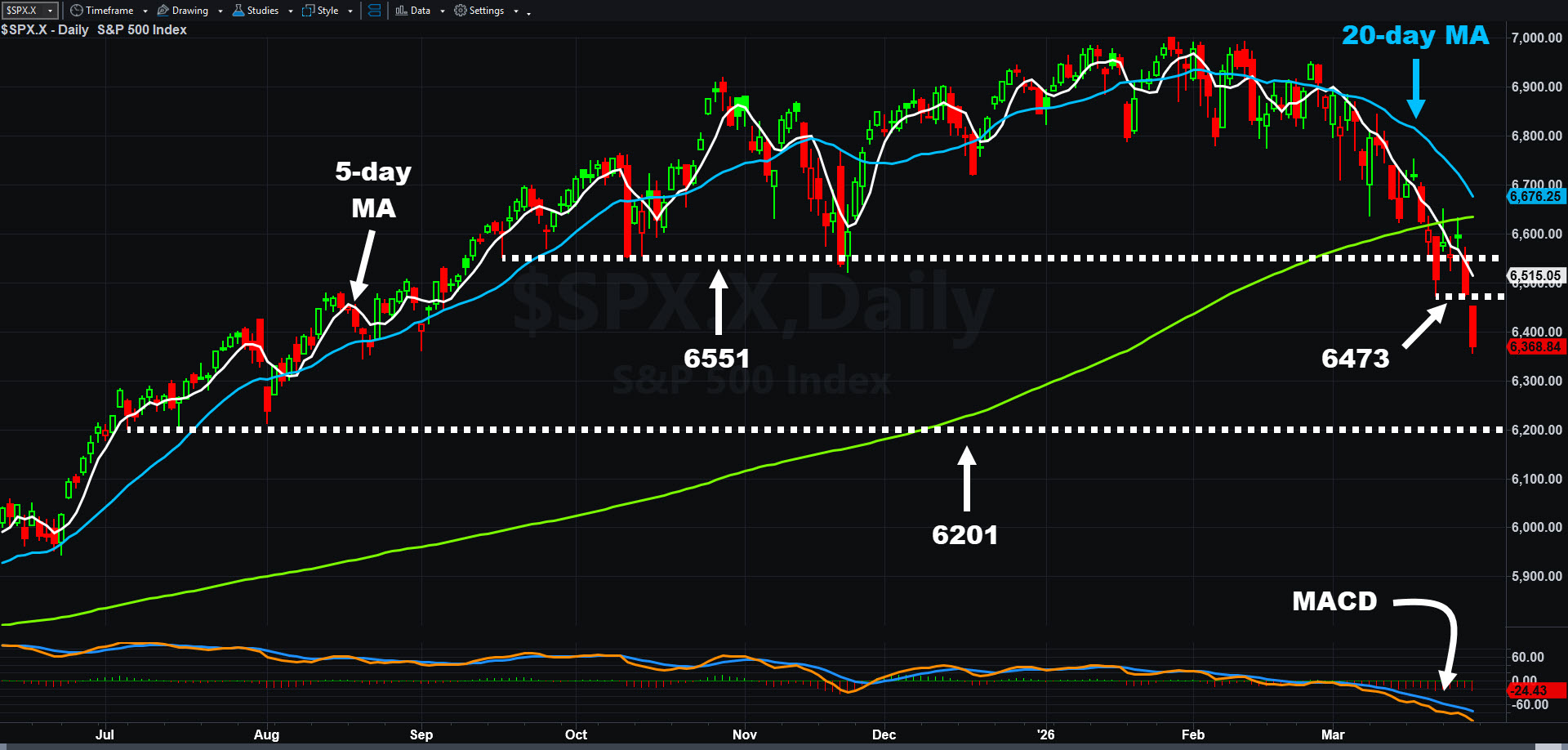 Prices consolidated for several sessions below their 200-day moving average and tried to hold a support zone around 6,551. However Friday’s drop decisively violated those levels.