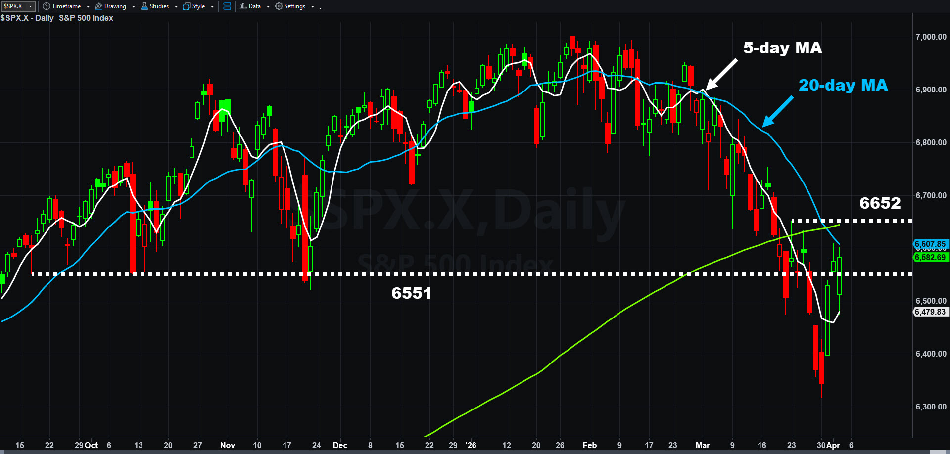 S&P 500, daily chart, with select patterns and indicators.
