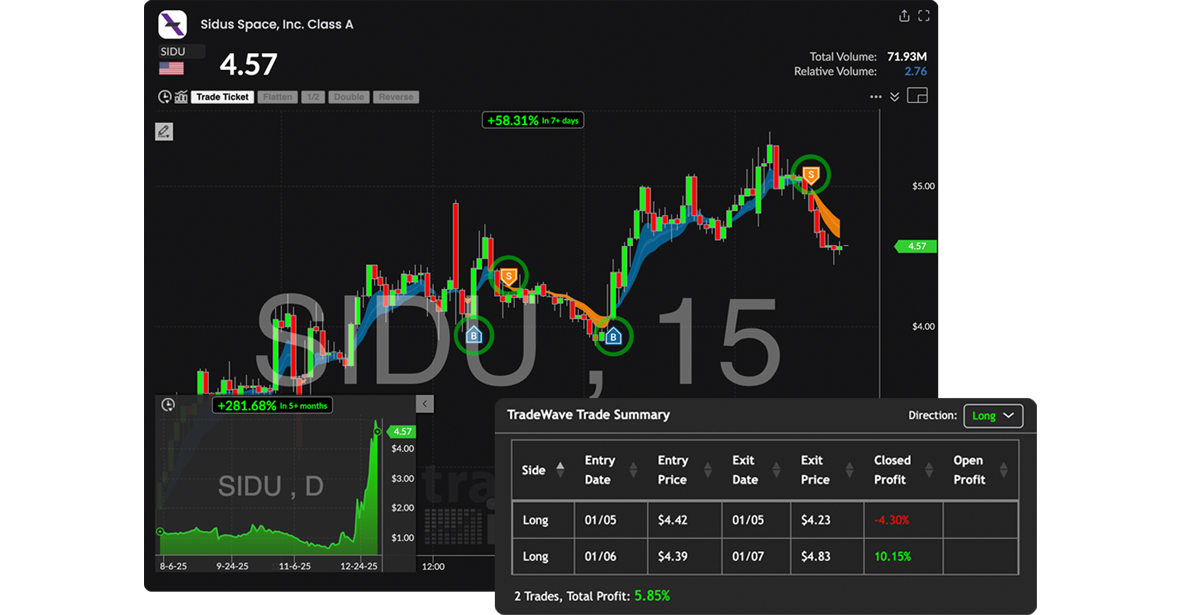 Trend-aware chart signals: See adaptive, color coded TradeWave signals and picture in picture charts that combine multiple timeframes and real time metrics in a single view.